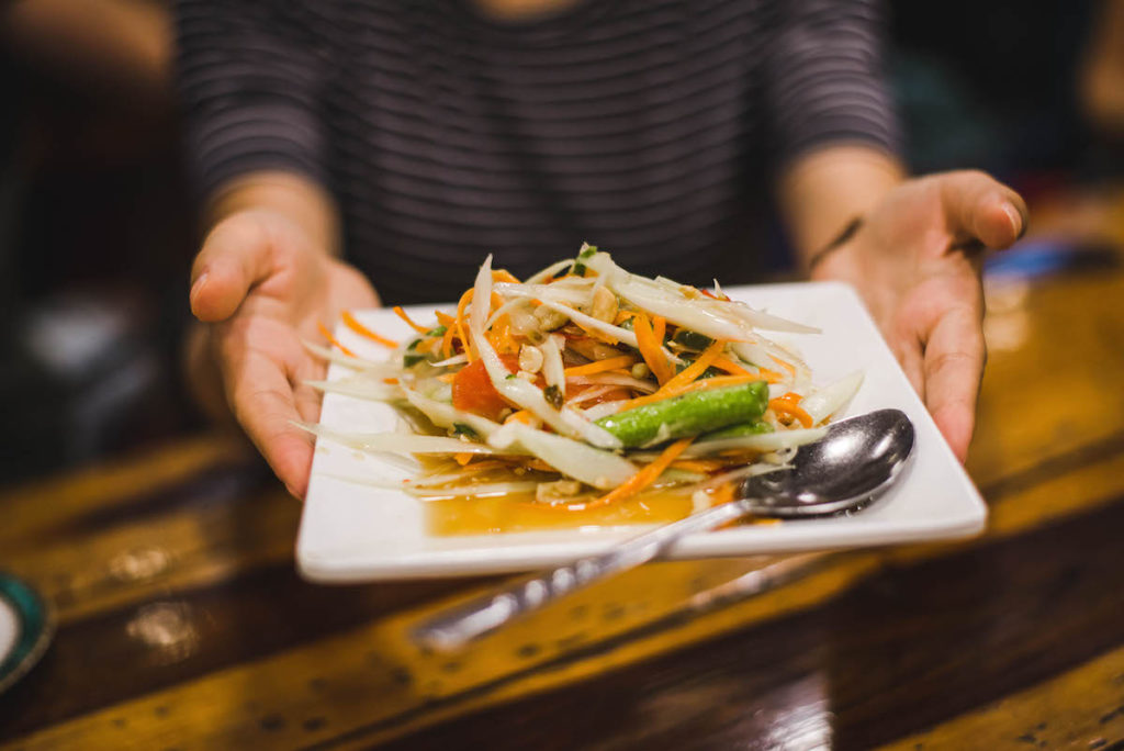 Bei uns standen folgende Gerichte auf der Speisekarte: Hühnchen bzw. Tofu in Pandanblättern („Gai Hor Bai Toey“), eine scharfe Garnelen- bzw. Gemüsesuppe („Tom Yam Goong“) und Schweinefleisch bzw. Tofu mit Holy Basil („Phat Kra Pow Moo Sab“). Und als Dessert gab es die leckersten Kokosnusspancakes: „Ka Nom Krok“. Am Ende des Kochkurses gibt’s Mittagessen. Und natürlich werden hier die selbst zubereiteten Speisen gegessen.
