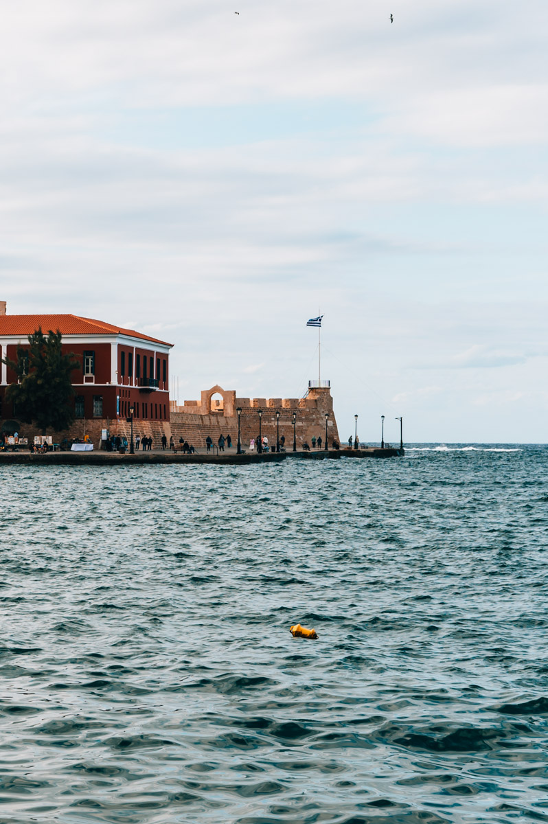 Du kommst hier unter anderem am historischen Wachhaus des Venezianischen Hafens vorbei. Heute beherbergt das Gebäude ein gut besuchtes Café („Chania Sailing Club – Neorio Moro“), in dem du dir ein kühles Getränk mit Blick aufs Wasser schmecken lassen kannst.