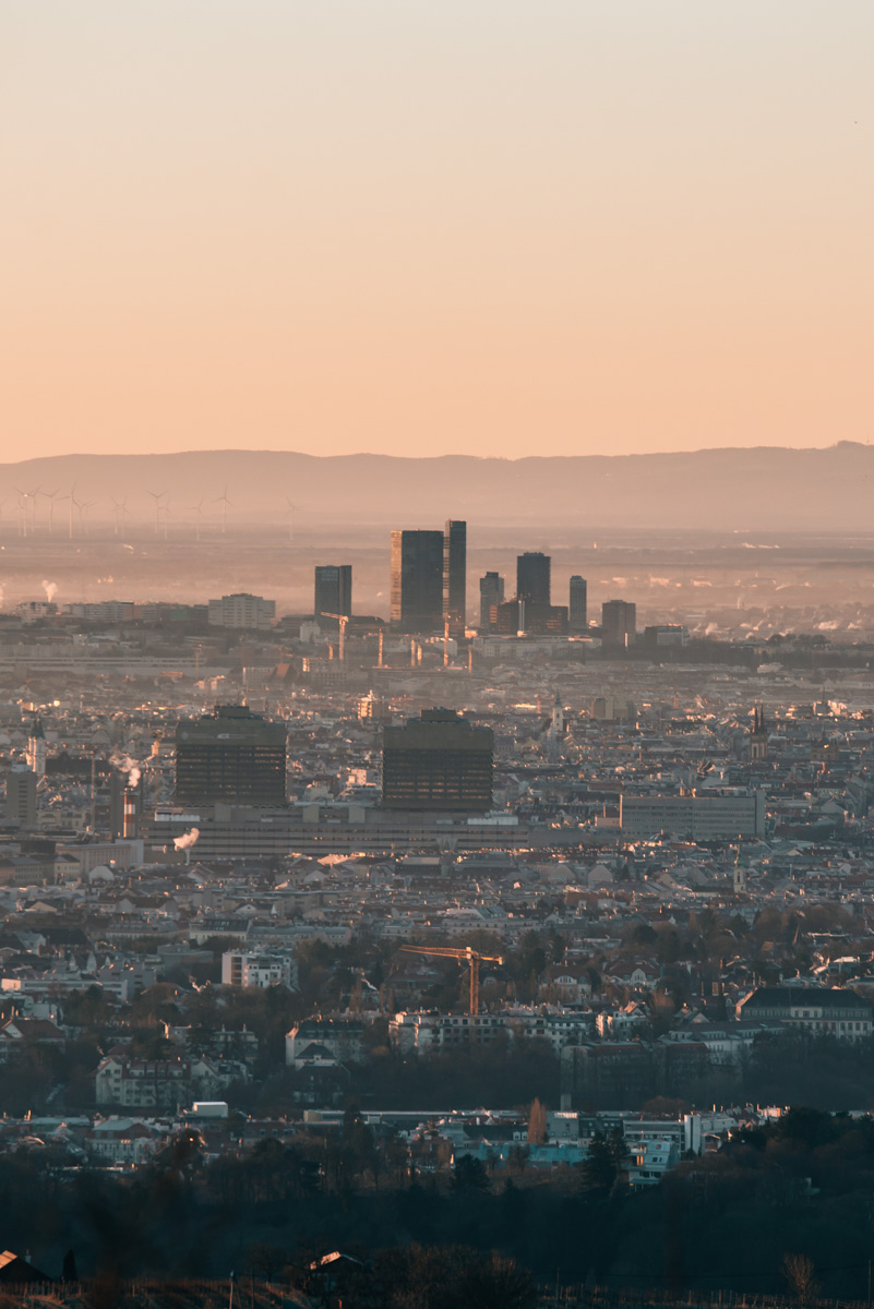 Obwohl wir fast immer zum Sonnenuntergang dort sind, ist der beste Zeitpunkt für einen Besuch der Jubiläumswarte der Sonnenaufgang. Wien befindet sich nämlich Richtung Osten und mit etwas Wetterglück geht die Sonne direkt hinter der Stadt auf. Im Westen blickst du Richtung Wienerwald – ebenfalls schön, aber nicht ganz so aufregend wie der Blick Richtung Stadt.