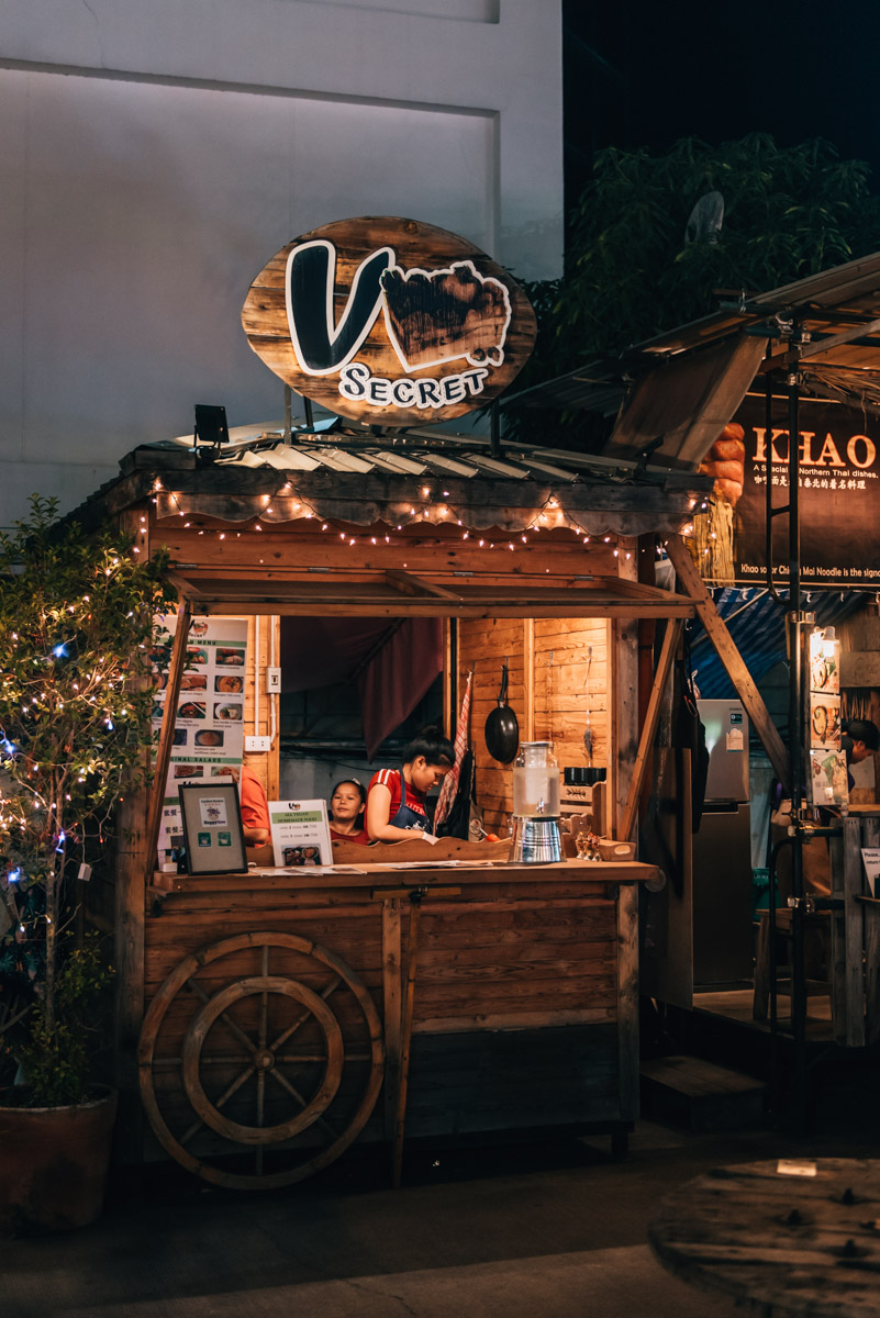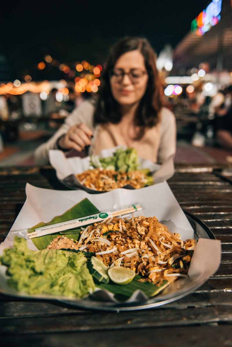 The Ploen Ruedee Night Market is somewhat reminiscent of an international street food festival. There are stands with dishes from all over the world: From Thai to burgers to kebab and also Mexican and Indian, they have everything here. We had a delicious meal from the vegan stand called “V Secret”.