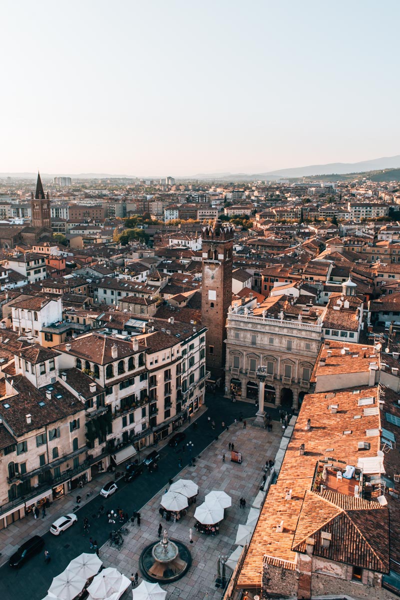 You definitely get the best birds-eye-view close to the town centre from Torre dei Lamberti. This striking tower rises up from Verona’s town centre 84 metres into the sky.