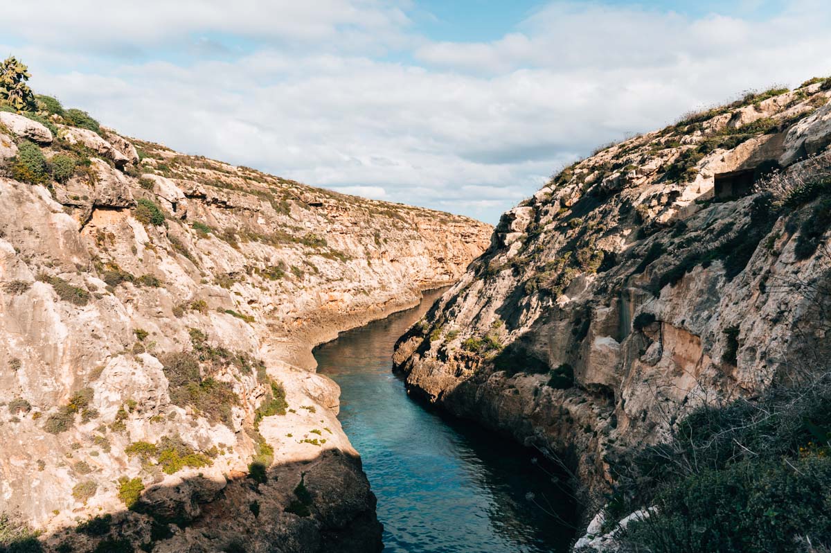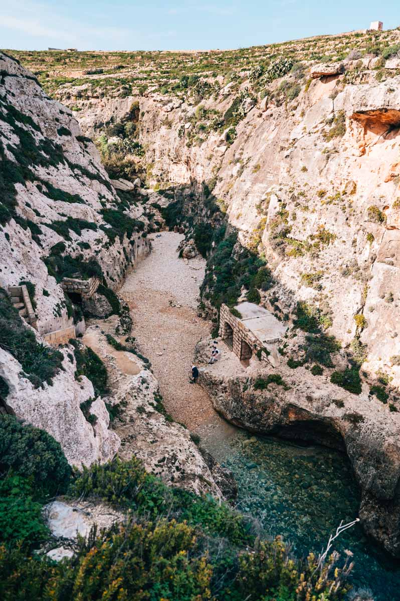 Eine weitere eindrucksvolle Schlucht im Norden von Gozo ist Wied il-Għasri. Vom kleinen Parkplatz erreichst du die abgeschiedene Schlucht in wenigen Minuten zu Fuß. Über eine Treppe kannst du in Serpentinen hinab zur winzigen Bucht gehen.