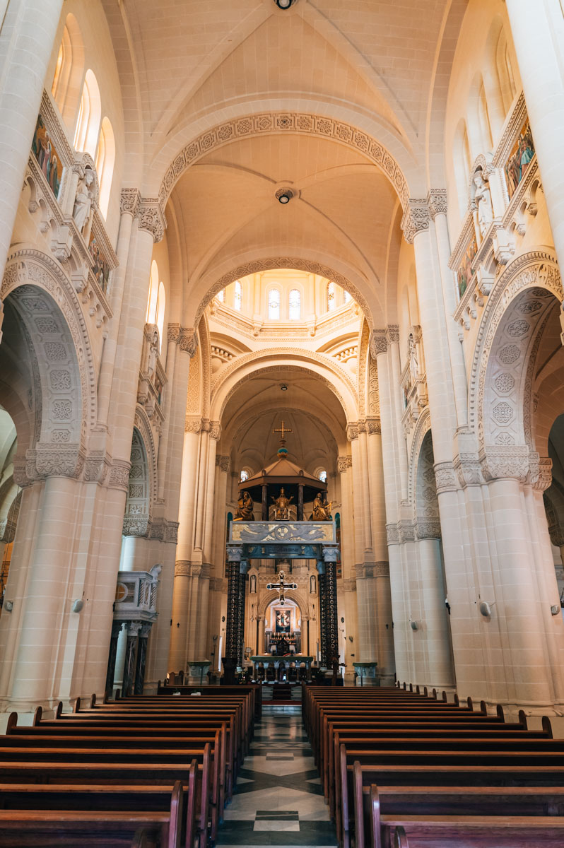 Im ruhigen Landesinneren von Gozo, nicht weit von der Küste entfernt, thront die eindrucksvolle Basilika Ta‘ Pinu. Sie ist der wichtigste Wallfahrtsort der Insel und eine der wichtigsten Kirchen Maltas. Auch wenn du sonst mit sakralen Bauwerken nicht viel am Hut hast, lohnt sich ein Zwischenstopp bei dieser Sehenswürdigkeit unbedingt.