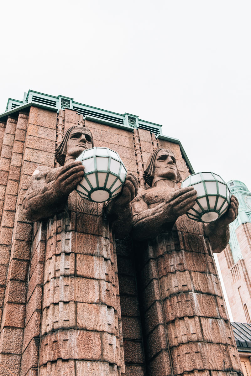 An der Granit-Fassade des Haupteingangs thronen vier überdimensionale, gewaltige Statuen. Sie erinnerten uns fast schon an einen brutalistischen Baustil. Jedenfalls zählen sie zu einem sehr beliebten Fotomotiv in Helsinki.