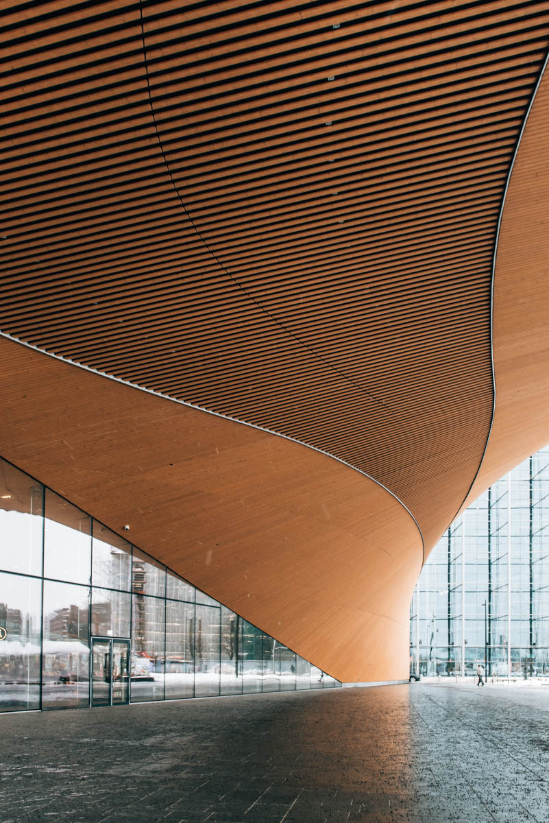 Die Zentralbibliothek Oodi wurde erst im Jahr 2018 eröffnet und ist somit eine der neuesten Sehenswürdigkeiten der Stadt. Schon beim Eingang erkennt man die ungewöhnliche Architektur: Das moderne Meisterwerk aus Glas, Stahl und Holz erinnert an eine gewaltige Welle.