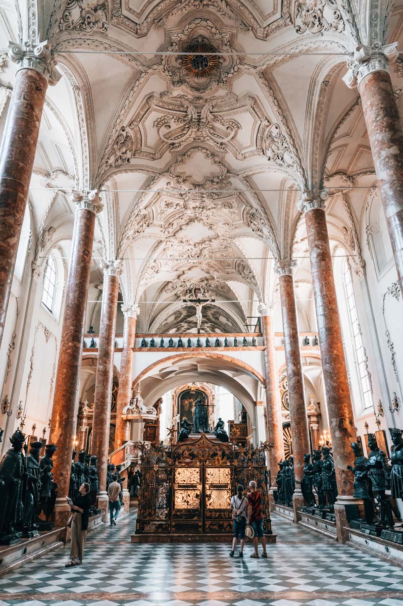 Eine weitere wichtige Sehenswürdigkeit in Innsbruck ist die kaiserliche Hofkirche. Hier erwartet dich eine Besonderheit: Im prunkvollen Innenraum der Hofkirche befindet sich nämlich das Grabmal von Kaiser Maximilian I. Spannendes Detail am Rande: Das Grab ist leer – begraben wurde der Kaiser letztlich in der Burg von Wiener Neustadt.