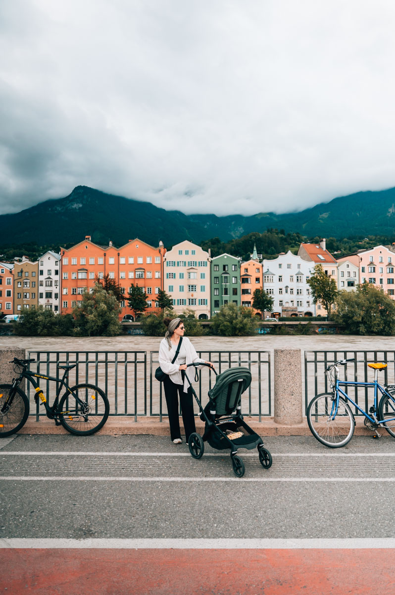 Los geht’s mit dem absoluten Postkartenmotiv in Innsbruck, dem wunderschönen Blick auf den Inn, die bunten Häuser der Mariahilferstraße sowie die majestätischen Berggipfel im Hintergrund. Wer Innsbruck besucht, sollte sich diesen Fotospot definitiv nicht entgehen lassen.