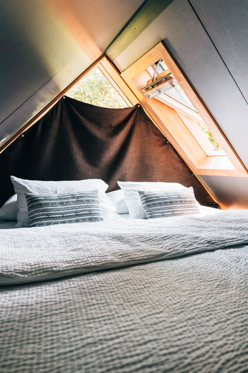 Mehrere kleine Tiny-Häuser sind um einen Pool angeordnet. Manche von ihnen schweben förmlich als Baumhäuser in der Luft, andere sind bodennah. Wichtig zu wissen: Die Unterkunft ist nichts für Menschen mit körperlichen Einschränkungen. In den zweistöckigen Häusern befindet sich das Bett im Obergeschoß, welches über eine recht steile Treppe erreichbar ist.