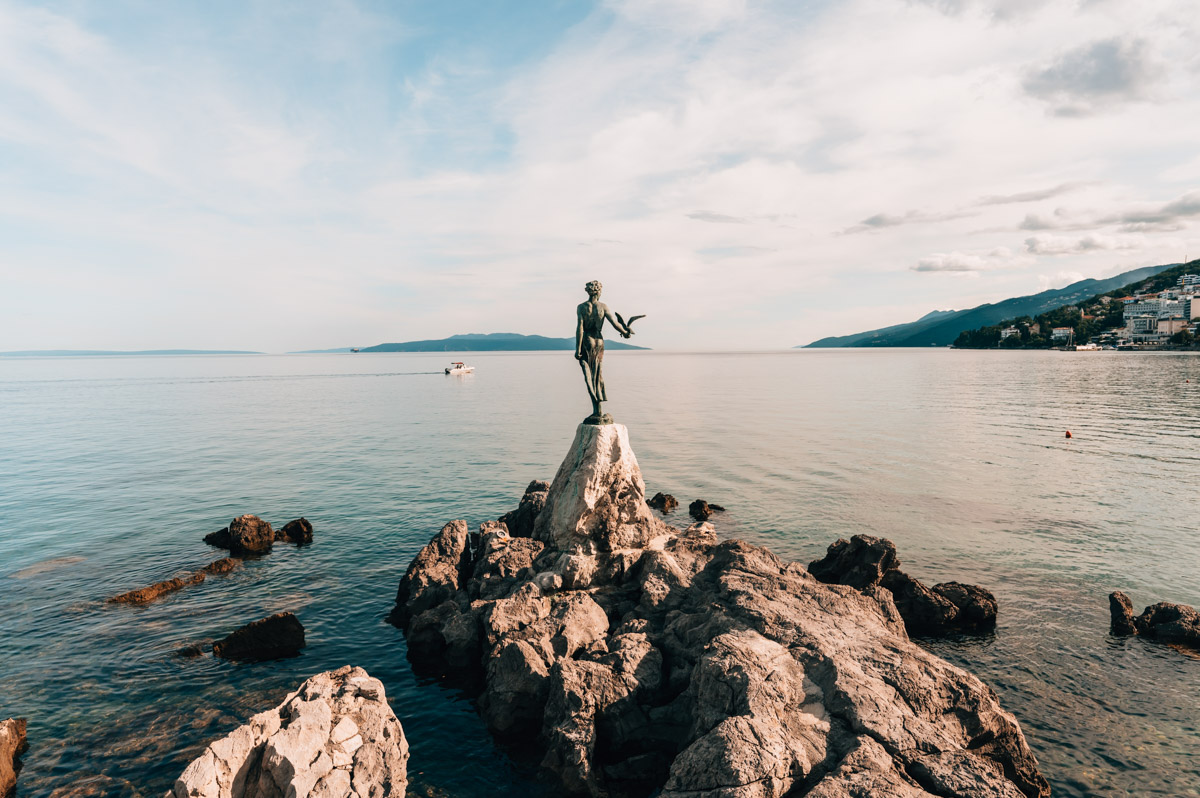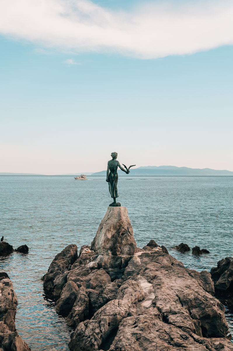 Seit dem Jahr 1965 thront das Mädchen mit der Möwe vor der Küste Opatijas. Die Skulptur stammt vom kroatischen Bildhauer Zvonko Car. Vom winzigen „Platz“ vor der Skulptur genießt du einen netten Blick auf Opatija.
