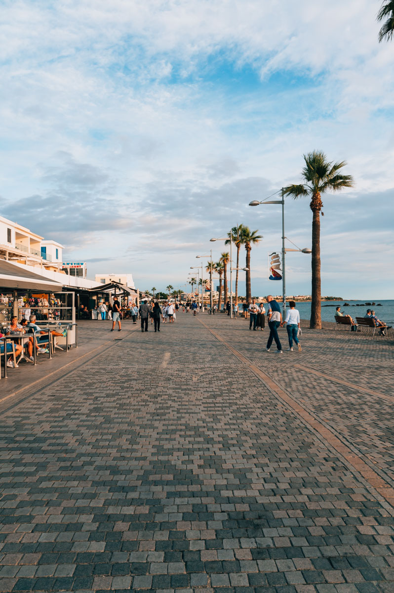 Eine Sehenswürdigkeit in Paphos, die du mindestens einmal zu Gesicht bekommen wirst, ist die palmengesäumte Promenade. Hier geht es untertags sehr beschaulich zu, abends ist dann häufig etwas mehr los. Das liegt unter anderem daran, dass sich im Bereich rund um den Hafen einige Restaurants befinden.
