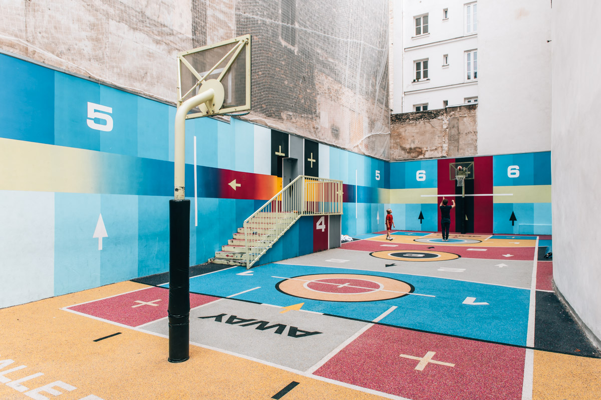 Die Bemalung wird alle paar Jahre in Zusammenarbeit mit Künstler*innen erneuert, sodass der Platz immer wieder ein neues Aussehen erhält. Das Kunstwerk ist übrigens nicht nur schön anzusehen, hier wird selbstverständlich auch Basketball gespielt.