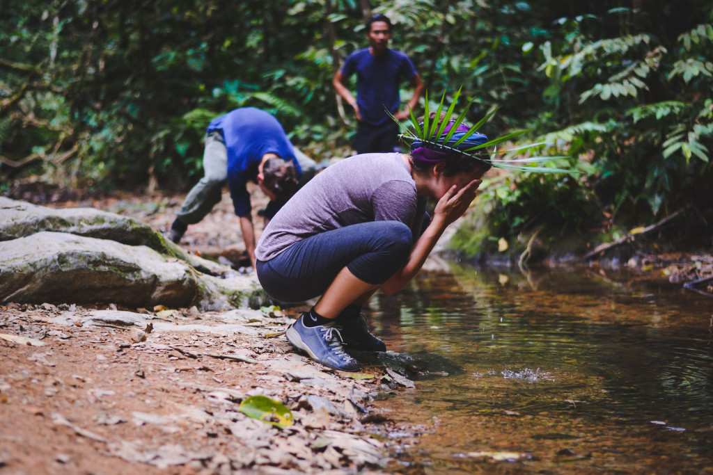 Am nächsten Morgen versammeln wir uns am Flussufer. Wir trinken Tee, essen Kekse und warme Sandwiches. Flussaufwärts bahnen wir uns den Weg zu einem Wasserfall. Unsere müden Beine fühlen sich schwer an. Sie streiken ein bisschen, aber irgendwie schaffen sie es dann doch, die rutschigen Felsen zu bezwingen. Wir springen in die winzige, erfrischende Grotte und duschen uns unter dem Wasserfall. So fühlt sich Lebendigkeit an.