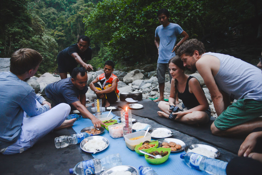 In der Dämmerung essen wir direkt am Fluss mit unseren Guides zu Abend. Es gibt Kürbis-Curry und Chicken Rendang, ein bekanntes indonesisches Gericht. Es schmeckt fantastisch. Unser Koch hat es für uns zubereitet, ja unser Koch, er hat das Essen für uns den weiten Weg aus dem Dorf hierher getragen. Wir denken an die lange, beschwerliche Wanderung und fühlen uns schlecht.