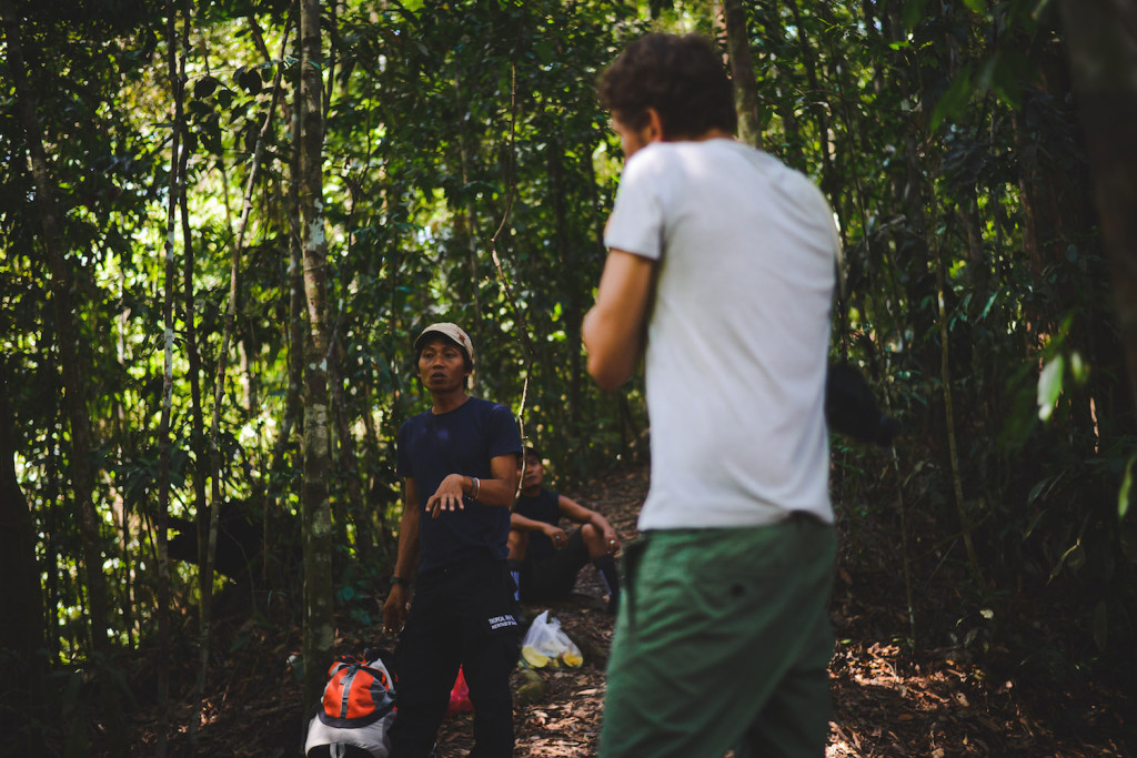 Keine 20 Minuten nachdem wir den Gunung Leuser Nationalpark betreten haben, treffen wir das erste Mal in unserem Leben auf einen Orang Utan. Noch können wir den Anblick nicht realisieren. Keine 3 Meter von uns entfernt kauen Mama- und Baby-Orang-Utan genüsslich auf ein paar Bananen herum. Wir sind bei der Fütterungstelle angekommen. Es gibt jeden Tag dasselbe: Bananen und Milch. Man hofft, dass die einseitige Mahlzeit die Orang Utans langweilt und sie sich wieder auf Futtersuche in den Dschungel begeben. Mindestens eine halbe Stunde stehen wir da, sagen kein Wort. Zu magisch ist dieser Moment, dieses erste Aufeinandertreffen.