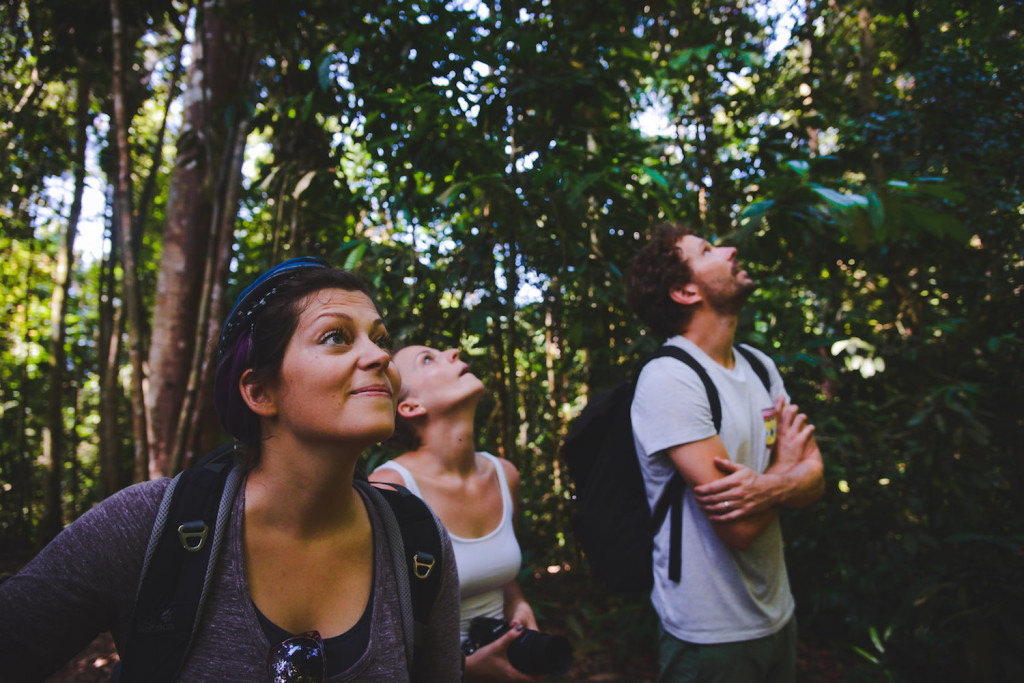 Der Dschungel fasziniert uns. Wir sehen Riesenameisen, die zwei Zentimeter oder größer sind. Wir sehen Blätter, so groß, dass man sich bei Regen unterstellen kann. Wir hören laut summende Bienen in Baumstämmen und sehen zum ersten Mal in unserem Leben Termiten. Das hier ist kein gewöhnlicher Wald, nein, es ist purer Dschungel. Dschungel, der sich herrlich unberührt anfühlt, selbst dann, wenn wir auf dem Trampelpfad der TouristInnen laufen. Wir begegnen Gibbons und anderen Affen und erreichen eine kleine Oase mitten im Dschungel. Mit dem Flusswasser waschen wir die Anstrengungen der letzten Stunden ab. Wir können nicht glauben, was dieses Fleckchen Erde alles für uns bereit hält.