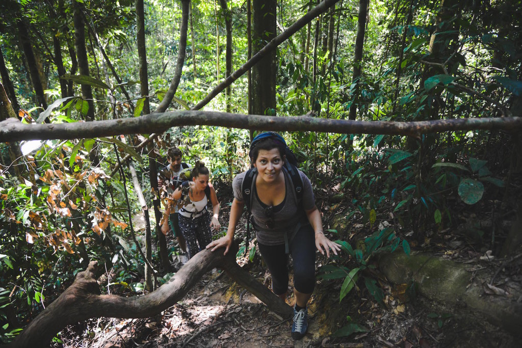 Unser Adrenalinspiegel sinkt und zum ersten Mal an diesem Tag macht sich eine gewisse Müdigkeit in unseren Beinen bemerkbar. So eine Dschungeltour, müsst ihr wissen, geht ständig bergauf und bergab, bergauf und bergab. Nichts mit gemütlichem Spaziergang oder so. Mitunter ist das Gelände so steil, sodass wir an den Wurzeln nach oben klettern müssen. Lianen und schmale Bäume erweisen sich als äußerst nützlich, denn an ihnen können wir uns beim Bergab-Wandern gut festhalten.